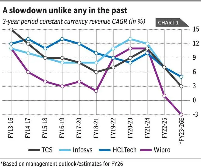 The three-year period from FY24 to FY26 is turning out to be the worst phase in the history of the major IT services companies. Neither during the dotcom bust nor the global financial crisis did they endure a slowdown as bad as in the current phase. For companies like TCS and Infosys, the FY23-26E revenue CAGR (at 3%) is witnessing a greater than 50 per cent drop. Even more stark in the case of Wipro. (see chart 1)