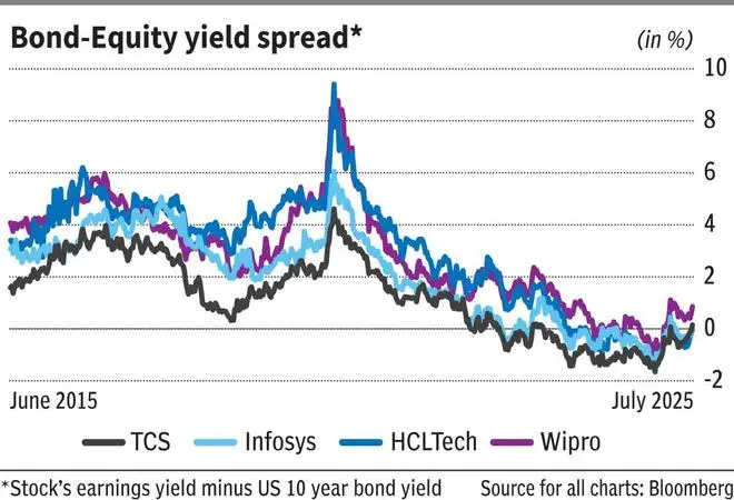 Earnings yield or (1/PE) is a rule of thumb measure to assess the relative attractiveness of a stock vs other options. For example, take the 10-year risk-free rate in India, which is at around 6.4 per cent. Today, TCS trades at a PE of around 22 times or earnings yield of 4.5 per cent .Why should an investor go for it when one is assured of 6.4 per cent annual return from a risk-free investment? The belief here is that TCS’ earnings will grow and over a 10-year period, the growth in earnings will make up for the lower starting point. Ideally, apart from high-growth companies, one must be cautious when buying a stock with earnings yield well below risk-free rate as in the above example. Yet, TCS traded at above 35 times two-three years ago, implying an earning yield of just 2.8 per cent and lower. Investor speculation apart, this was sustained by the relative attractiveness of the stock not to an Indian investor, but an FII whose alternate option was near-zero risk-free rate in developed economies. With global bond yields surging in the last two years, the relative attractiveness of Indian IT stocks has significantly diminished and poor performance apart, this too is a factor in the significant valuation derating in stocks. And measured by this metric — IT stocks’ earnings yield minus US 10-year bond yield, they are as unattractive as they have been in the last 10 years.