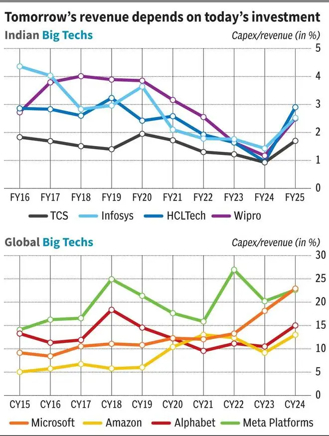 In the last 10 years, Indian Big Techs have invested a mere 1-4 per cent of revenue in capex versus significantly higher levels for Global Big Techs.