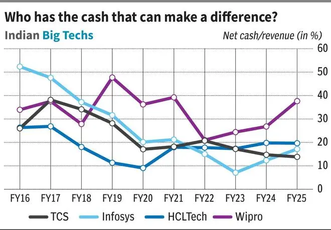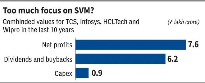 In the last decade, TCS, Infosys, HCLTech and Wipro have invested a mere ₹90,000 crore in capex. Meanwhile, nearly seven times this amount — around ₹6.2 lakh crore — has been returned to shareholders as dividends and buybacks.