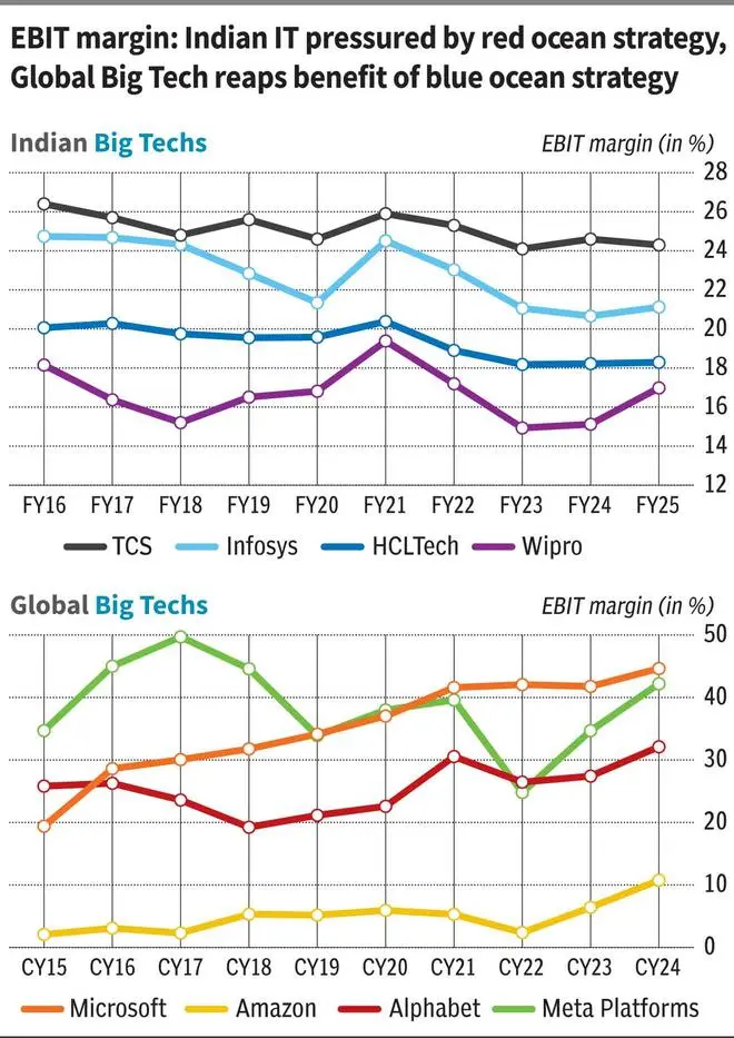 In the last 10 years, despite a tight leash on costs, minimal capex, successful transformation of business from legacy to digital services and rupee depreciation, the margins of IT majors have been on a declining trend. Former TCS CEO Rajesh Gopinath had, years ago, set an aspirational target of sustainable EBIT margin band of 26-28 per cent, but that has remained elusive. Vishal Sikka, during his tenure at Infosys, had set an ambitious goal of achieving 30 per cent EBIT margin by 2020, but even in 2025 Infosys’ EBIT margins are way below that at 21 per cent.