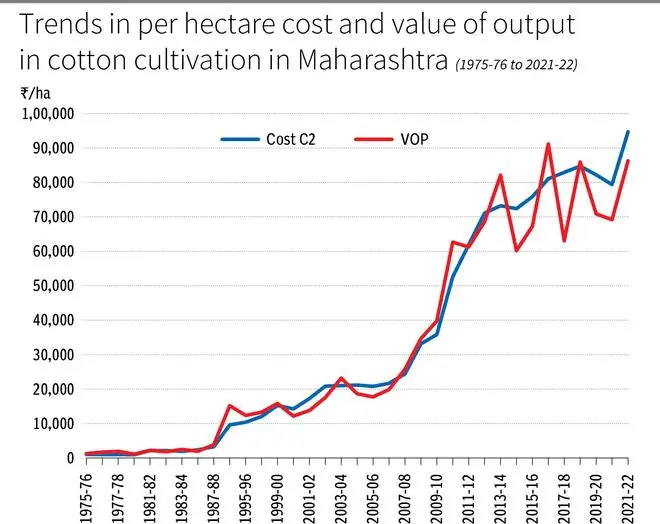 The cost and income numbers reveal the gravity of the problem. Data from the Commission for Agricultural Costs and Prices (CACP) show that per hectare C2 cost (which includes all the expenses incurred for crop cultivation including a fixed cost component) has increased many-fold. In Maharashtra, which accounts for one-third of India’s cotton area, costs rose from ₹14,234/ha in 2000-01 to ₹94,710/ha in 2021-22 and in Tamil Nadu, they skyrocketed from ₹28,149 to ₹1,24,493.