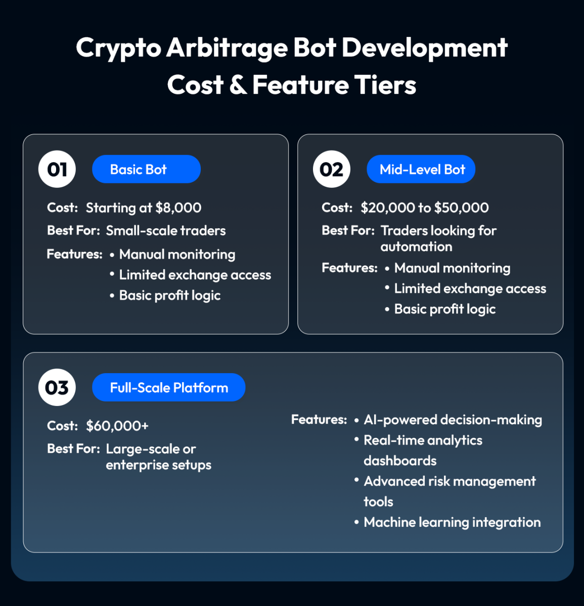 Key Takeaway: For a more personalized quote, reach out to a crypto arbitrage bot development company.