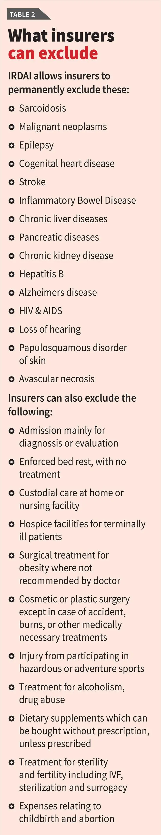 Insurers can also not give you cover if you are admitted for observation or bed rest without treatment, if elders need nursing care or attendants to help with their daily activities or if the policy buyer needs palliative care. Common treatments for childbirth, abortions, miscarriages, fertility, IVF etc can also feature as exclusions. Therefore, if you plan to take up such treatments, do check your health policy to plan accordingly. Insurers can also exclude bariatric surgery except when recommended by a doctor, cosmetic surgery (except in accidents), treatment for injuries from adventure sports, illegal activities, drug abuse etc.